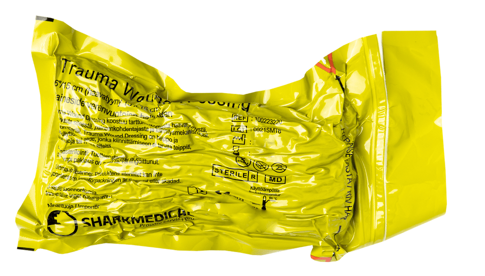 Trauma Wound Dressing verenvuotojen hallintaan. Monipuolinen paineside taktiseen hätäensiapuun.